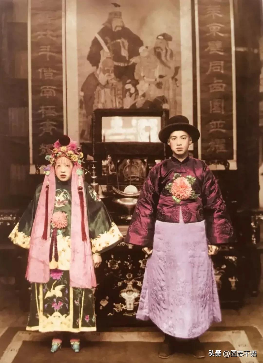 婚礼上的新娘和新郎不知为何,看到这张照片中新郎和新娘面无表情的样子和他们的装扮,总有一种怪异、瘆人的感觉。
