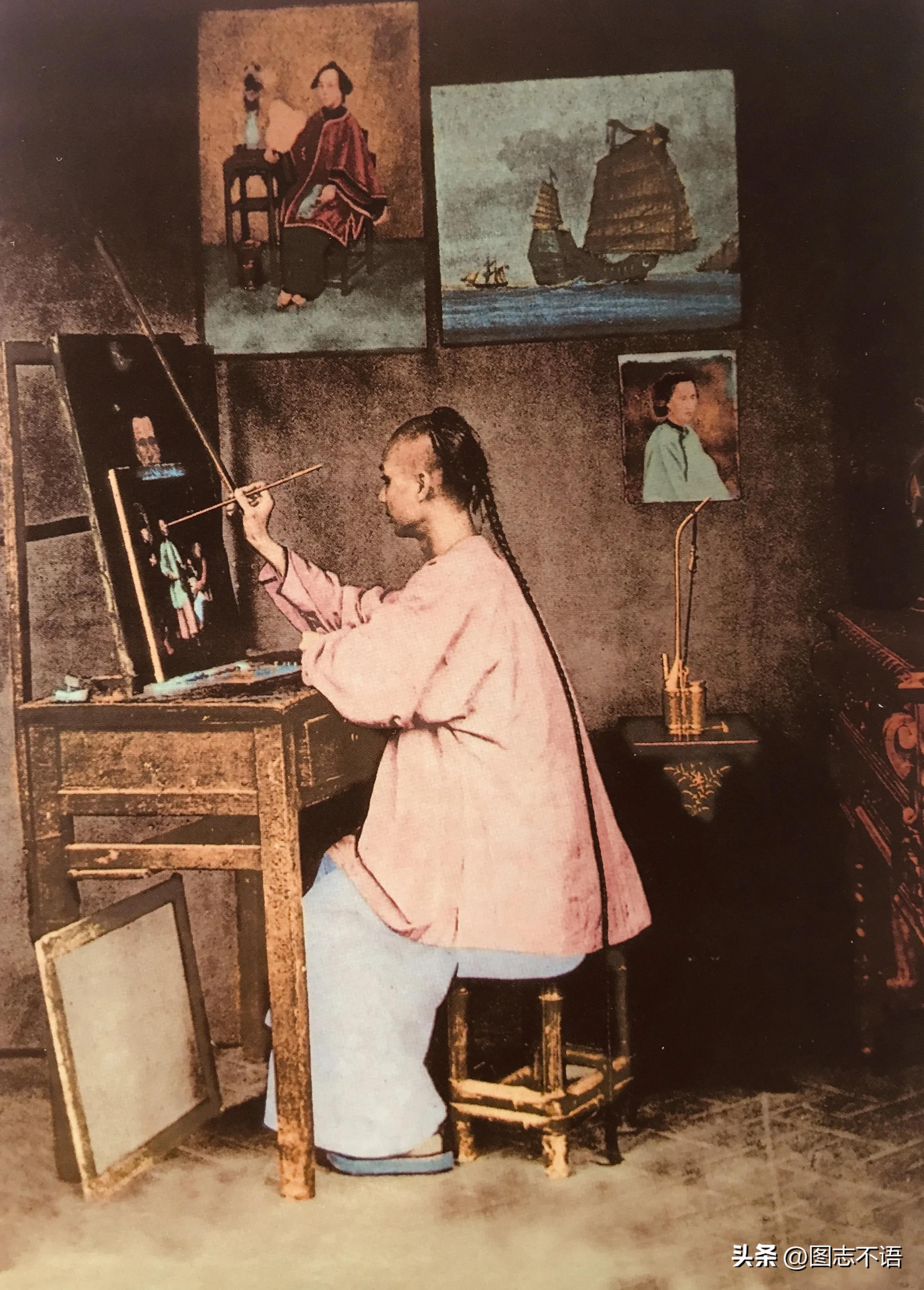 专心绘画的画师从画师墙上的作品来看,当时中国的绘画风格已经受到了西洋画的影响,从写意转变为了写实风格。