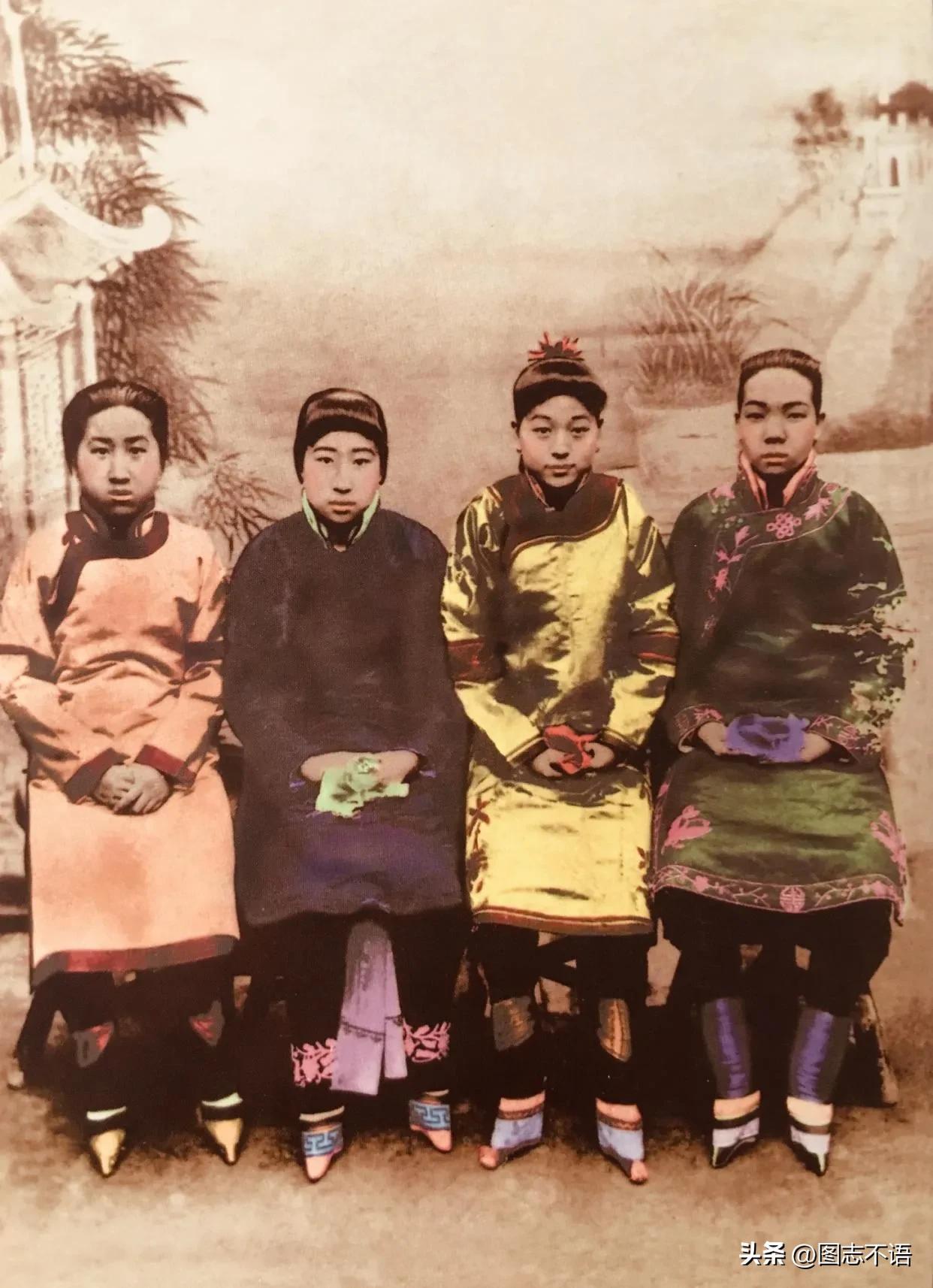 四姐妹合影这四名女子都是三寸金莲。当时只有汉族女子才会裹小脚,满族女子是不会裹小脚的。