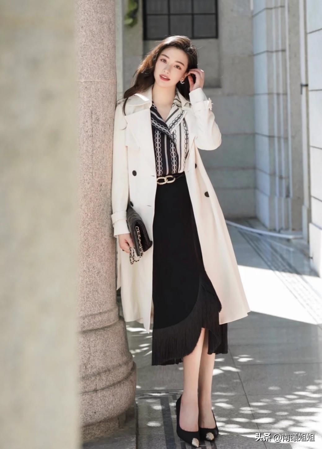 裙装作为内衬的搭配单品,好自身就带着一定的修衬力,优先选择搭配高腰、膝下的长度可以的提腰际线,分割上短下长的身材比例,延长下半身的长度和整体的身形线条。搭配风衣也要更具修身型,更显高。