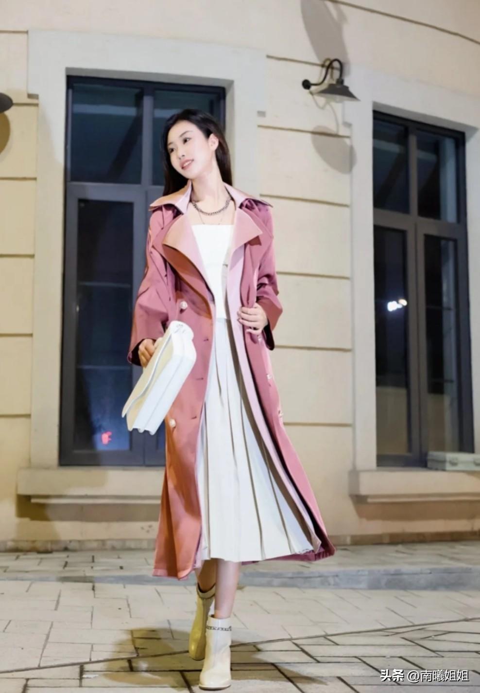 裙装作为内衬的搭配好可以与风衣的宽度形成较的松紧对比,贴身、修身的裙装搭配勾显纤细、好看的身材曲线,而加入宽松的风衣单品起到遮挡能力,两者结合丰富线条走向对比,衬托更显瘦、纤细的身形状态。