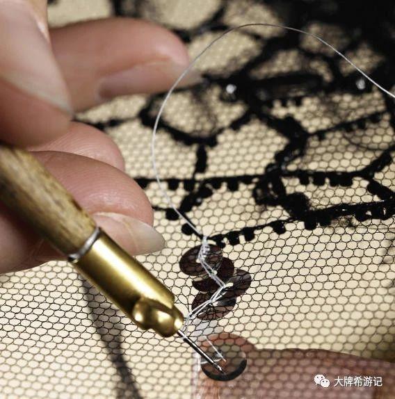 刺绣工匠使用 “吕内维尔 针刺法 Luneville embroidery"专用钩针 。它可以一次性将珠子,亮片等小配料预先穿起来一次性缝绣,但是必须反面缝绣,对技巧要求极高。刺绣工匠在厚布料上几乎是盲刺,必须 “ 以手代眼 ” 。一只手在布料下方推挤预先穿好的刺绣布料,另一只手在上方用钩针将材料固定。