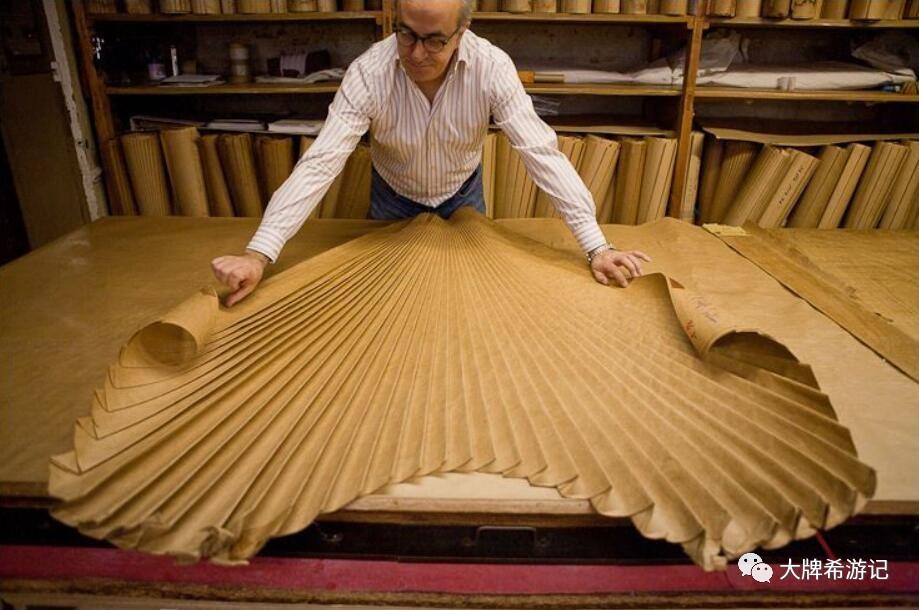 在Lognon褶饰工坊,大部分工作都由手工完成,,对于部分平纹褶,会使用专门的机器,但这些机器过于老旧,维护起来越来越难。其中一台爱马仕制作方块褶。它们带来的精细果是靠机器印制出来的成衣褶皱无法比拟的。
