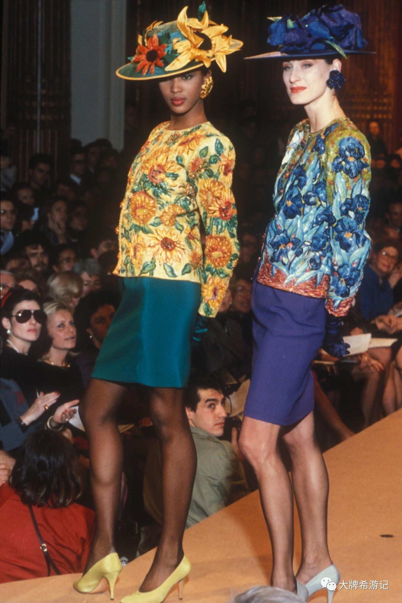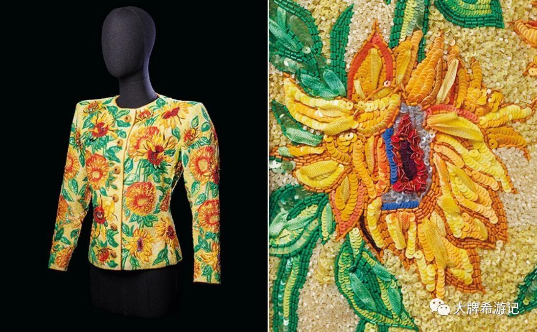 尤其是YSL与Lesage的合作长达40年之久,前两天佳士得刚刚成交了拍卖历史上贵的高级定制服装,就是YSL 1988 SS 的作品,灵感来自文森特·梵高的名画《向日葵》,由超模老米Naomi Campbell 穿着走秀。