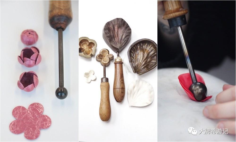 制作一朵传统的山茶花要从上浆开始,这道工序让材料足够有硬度,经过打孔钳的剪裁而散架。山茶花的花瓣≥16片,全部手工制作,花瓣经球星铁模加热塑形后,一片一片的装到花梗上。