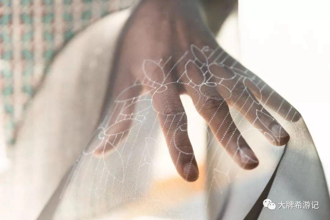 刺绣的图案细节敲定之后,批量印到透明纸上,不同的色块去标示不同的材料,制图员将用一台微型电刺孔机器在图案的每一根线条上刺孔。把打好孔的透明纸覆盖到面料上,再刷一层混合颜料和树脂的粉末。粉末穿过细孔就会在面料上留下痕迹。