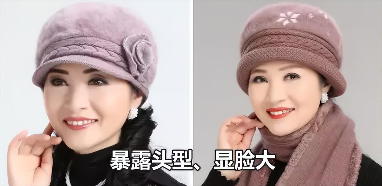 不过要注意,帽子的首先准则并不是时尚,而是对于脸型有修饰果,像很多帽子都会放大我们脸型的劣势,暴露缺点还容易显老。比如说很多中老年女性会选择这种针织帽,厚实的面料很容易显得头大。