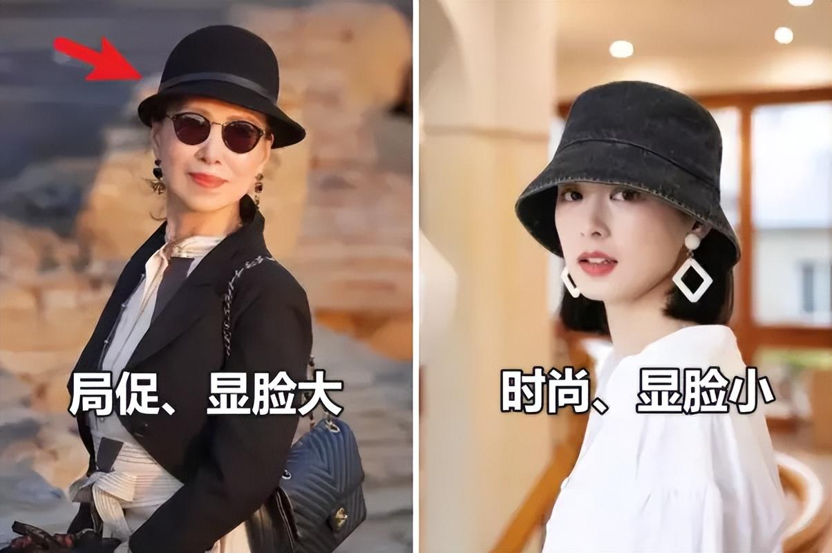 除了材质,款式上也有讲究,像高度、宽度等对脸部的影响也很好。例如这一组对比,同样的渔夫帽,但左边这一顶能感觉到整个脸部更大,且有一种突兀感,看上去很局促。相较之下,右边这一顶帽檐更宽,头围更松一点的脸部看上去更小,且时尚感也更强。