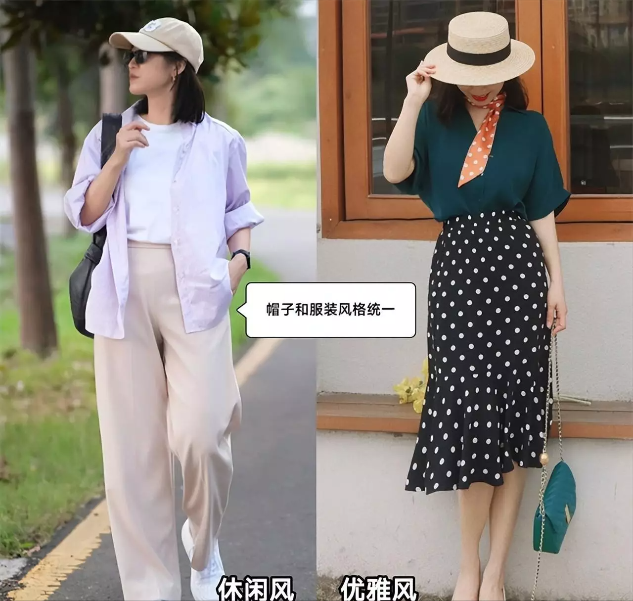 例如这一组对比,左边这一顶头顶带有小球设计的棒球帽看上去就没有右边简约的渔夫帽来得更加气质时髦。