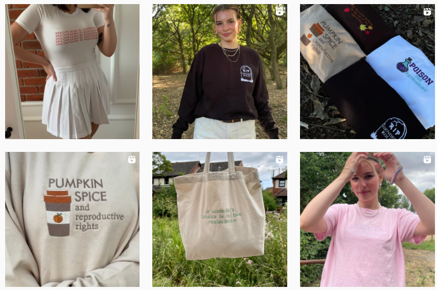 产品主要从批发商购买普通连帽衫、T 恤、套头衫和短裤等,通过再加工的形式,绣上促进女性赋权和解决女权主义问题的标语或插图,然而在网上进行售卖。