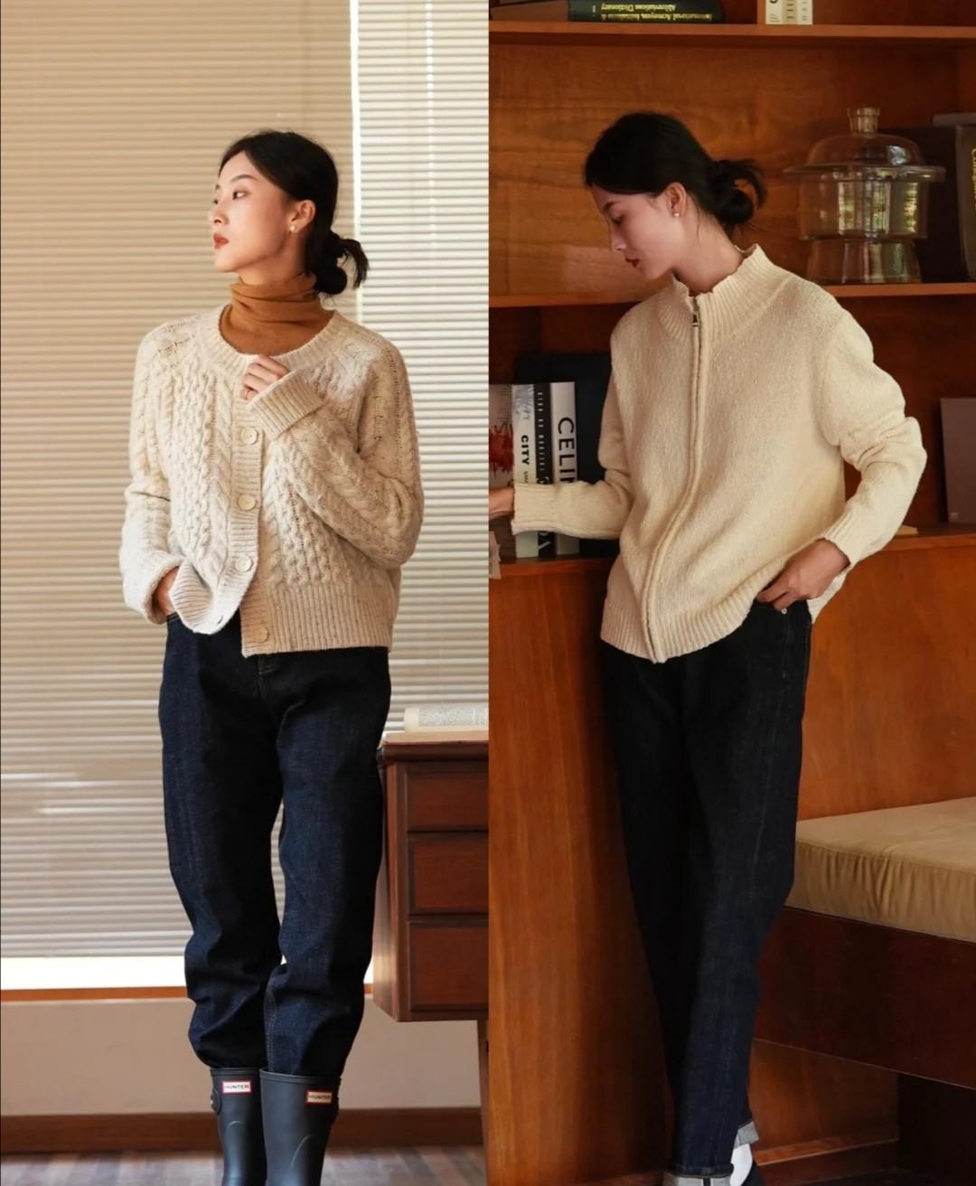 可以尽量使用一些颜色清爽的单品,减缓年龄感。像这两件白色的单品,它们都可以到了冬天当内搭使用,可以是短一点的白色毛衣开衫,在里面叠加高领单品,把脖子保护好。