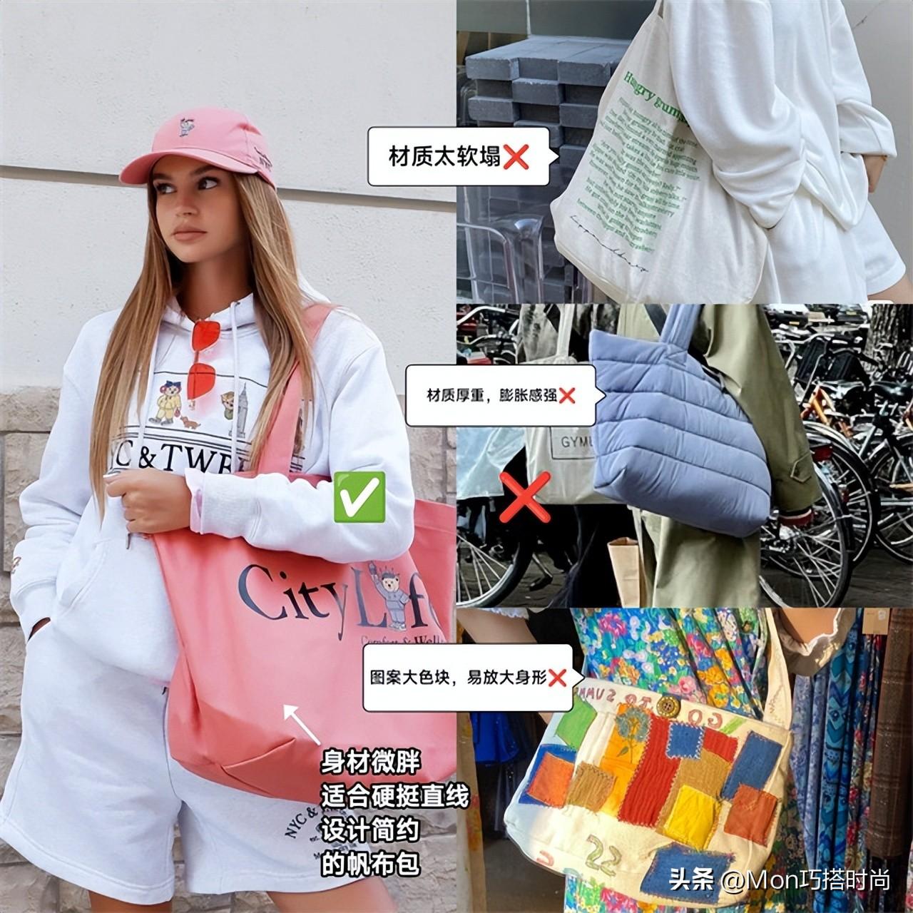 身材微胖或穿衣厚重的姐妹更适合选择直线款式、硬挺面料、设计简约的帆布包。过于软塌的质地、膨胀感强的羽绒、繁琐的大色块都容易显胖。