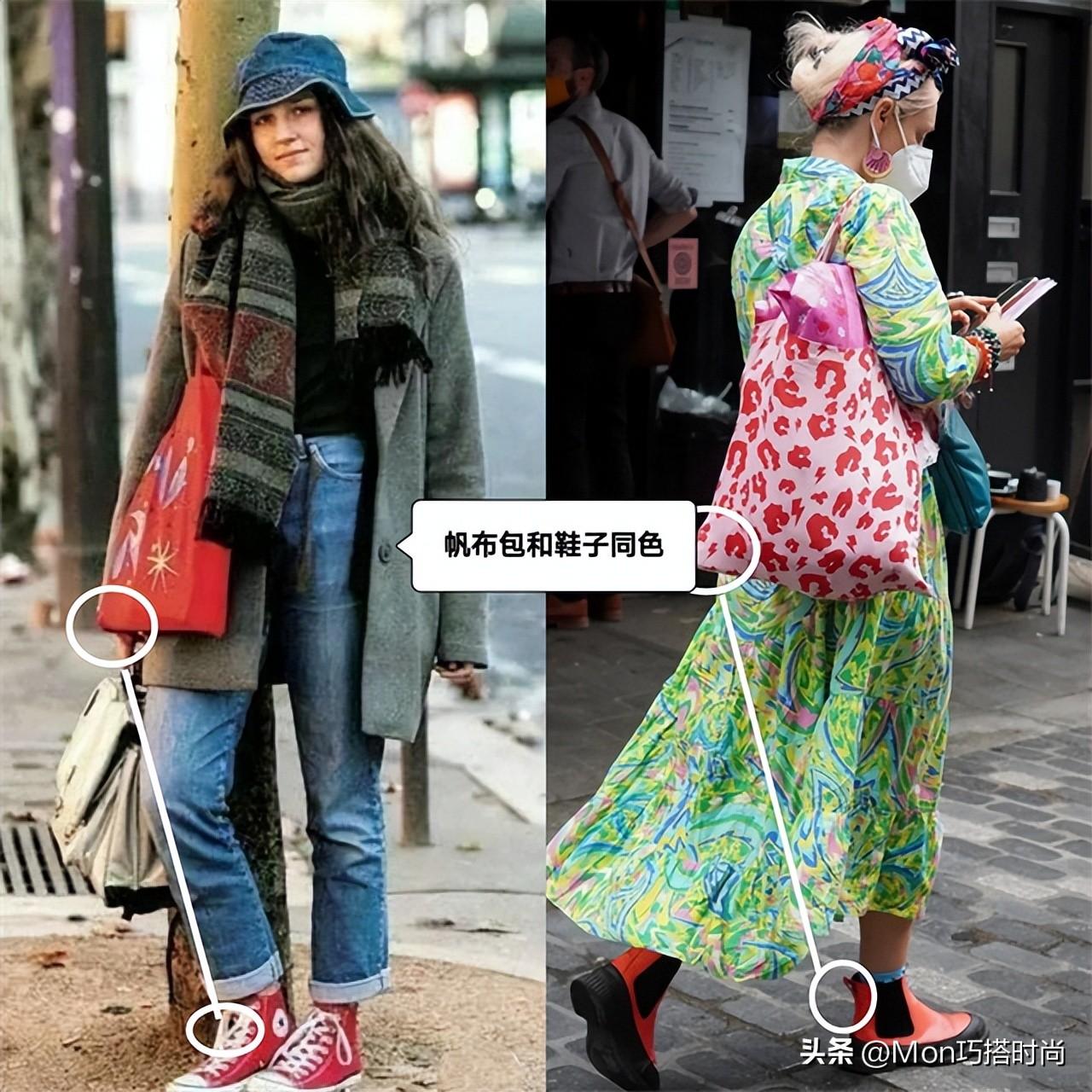 更有“心机”的穿法是让帆布包和鞋子形成颜色呼应,这种穿法用在彩色或图案款帆布包中有时尚感,可是法国时髦精的爱!
