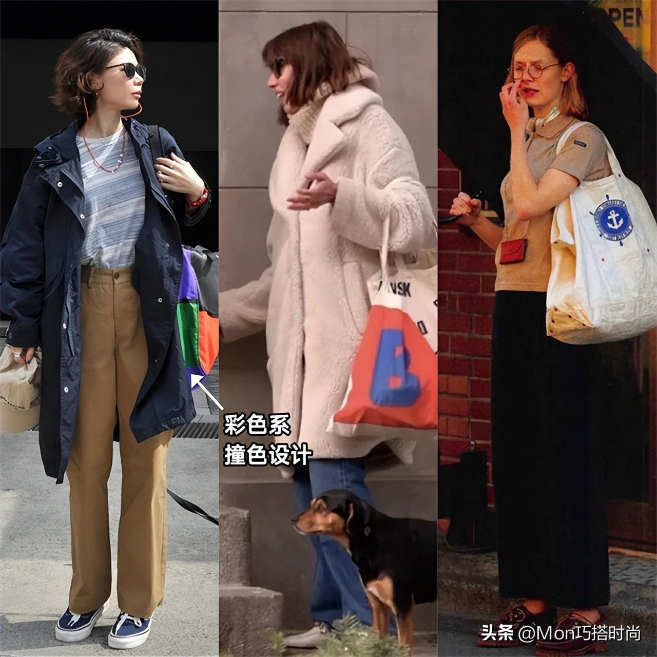 长款帆布包搭配灰色长风衣,是毫不刻意地高级;宽大的米色帆布包搭配及踝棕色大衣,配上尖头鞋、直筒裤的修身,也一点不臃肿。