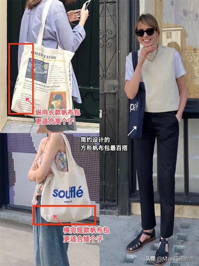 高个子选纵向长款帆布包会更显瘦。而长度在腰臀附近的简约帆布包,任何身高都能轻松驾驭,可以放心入手啦!