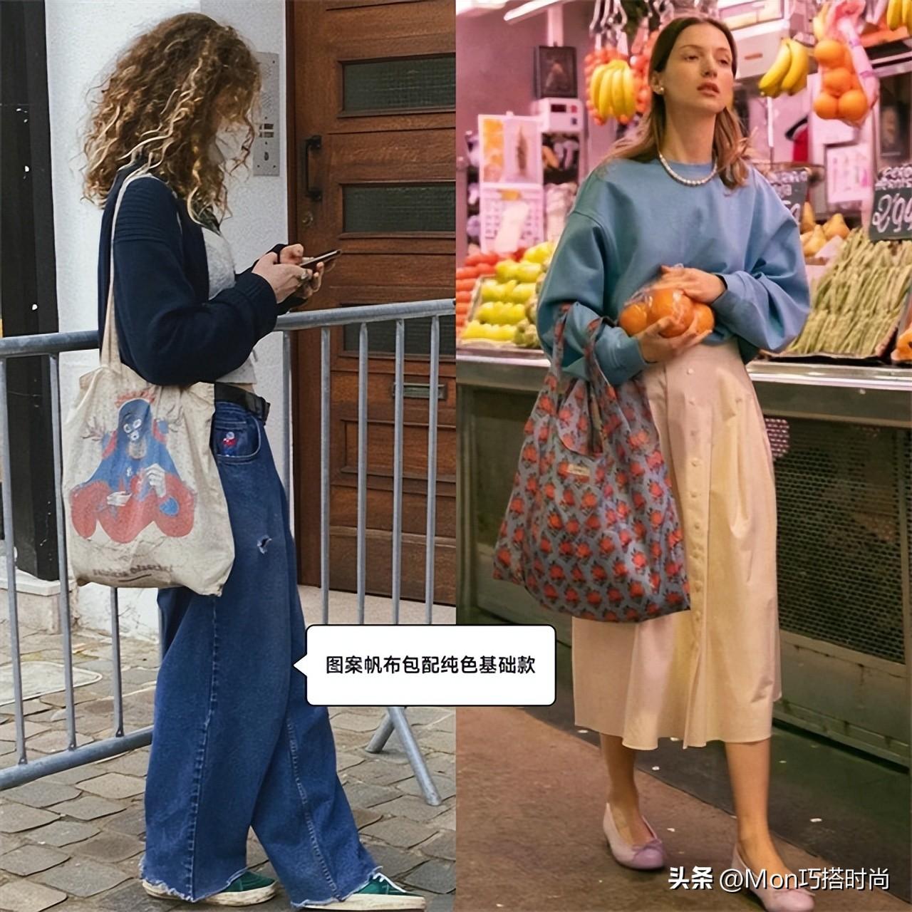 图案款帆布包好选择邻近色或同色系的设计,配上阔腿牛仔裤、米色伞裙,都是自带氛围滤镜的搭配。