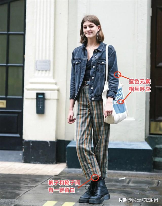 再安排一条格纹裤配马丁靴,让裤子和靴子之间有一定留白是法国女人的显高“小心机”~