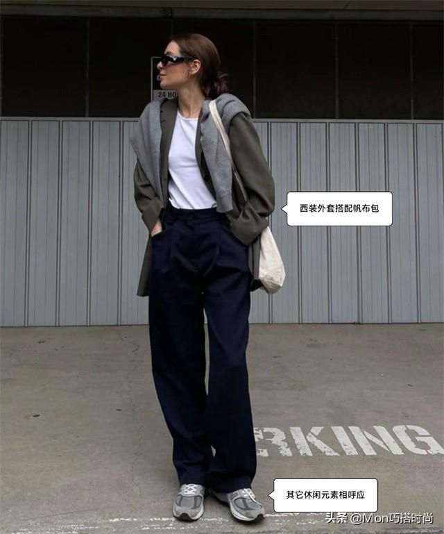 优雅的法国人也很爱用西装搭配帆布包。深灰色西装外套配上黑色西装裤,瞬间就有了干练清爽的气质。