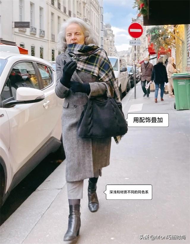 秋冬当然少不了大衣和帆布包的组合。深灰色长款大衣选用深浅和材质不同的同色系搭配,稳重气质,白发苍苍的年纪也能穿!