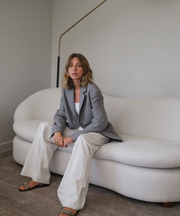 她挑选了一件灰色的西装来进行搭配,双排扣的设计给她带来了一些复古的感觉,是选择了一条比较宽松的白色长裤来进行搭配,让整个人看上去很是清爽。