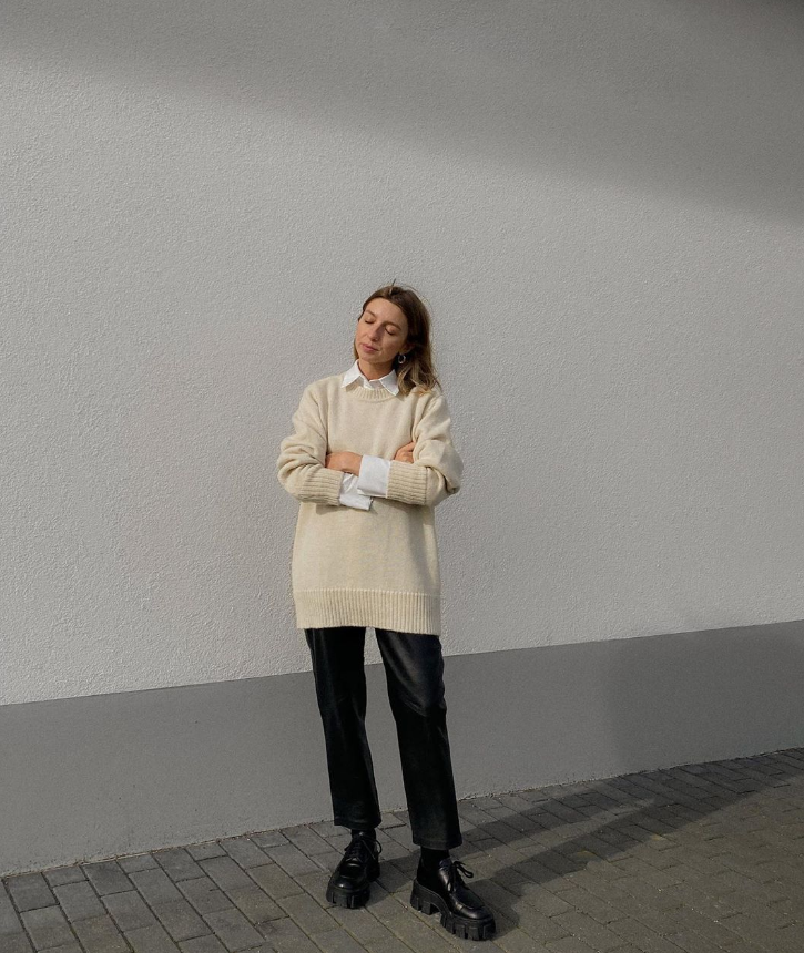 衬衫作为针织衫的内搭,把皮裤跟针织衫搭配在一起,在针织衫强大的温柔氛围感衬托下,皮裤变得女性化。