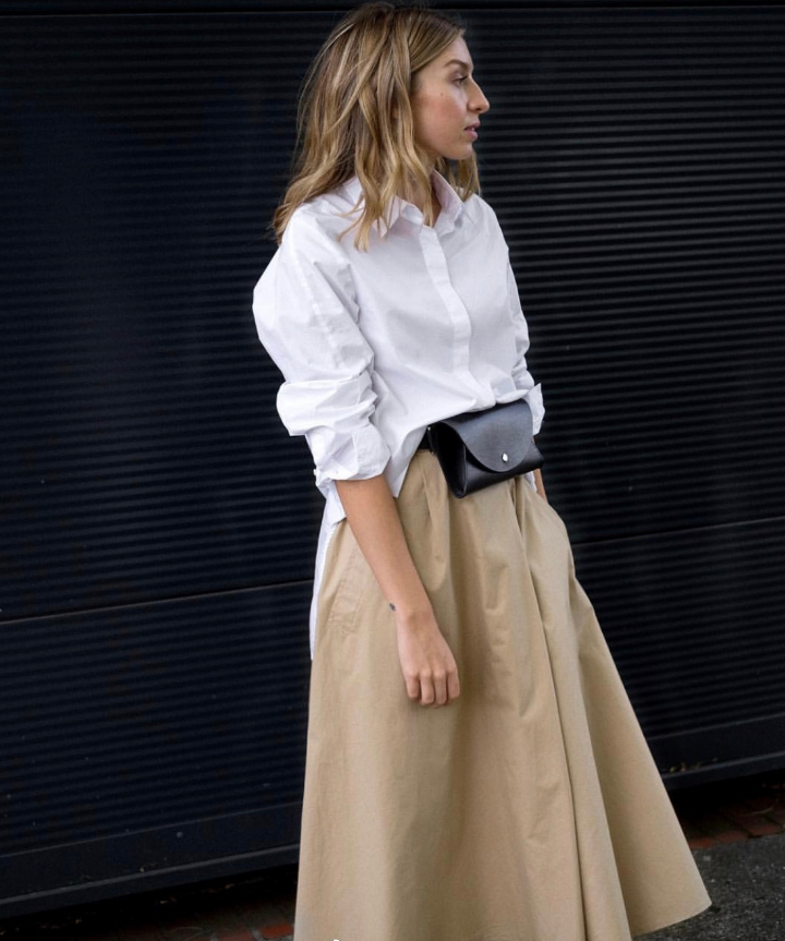 简约的白色衬衫,穿出一种随意感,宽松的版型更加舒适,带有一点帅气的中性风,英姿飒爽,干净利落。选择一件卡其色的半身裙,温柔又大气,展现出女性的魅力,更加别致优雅,一侧贴片的口袋设计,俏皮感十足。