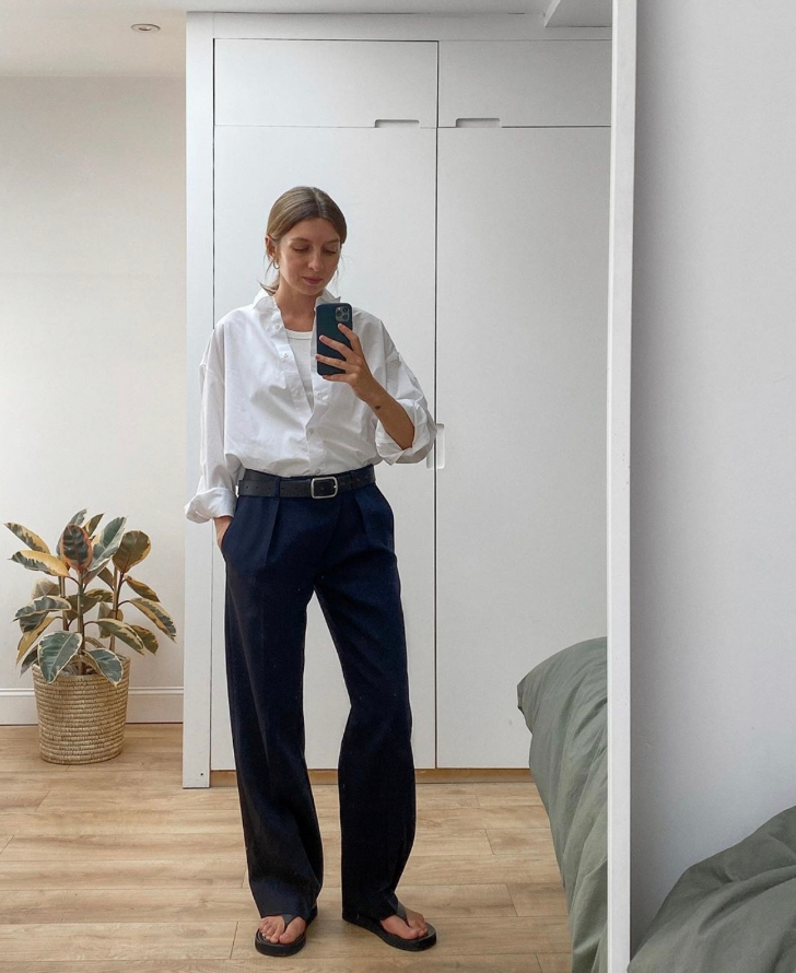 极简风穿搭正是当下很流行的一种风格,简简单单的白衬衫一直是夏季的单品,一年四季都可以穿,主要出现在职场中。大家可以选择简洁的白衬衫搭配藏蓝色的裤子,在夏天的职场中是很实穿的组合方式,知性帅气、落落大方。