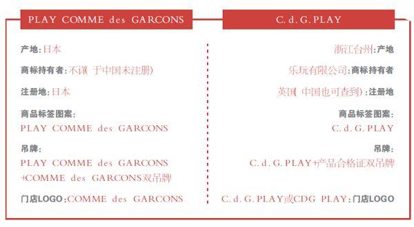 北京商报记者通过商标查询发现,C.d.G.PLAY商标于2018年1月底注册成功,现所有者为乐玩有限公司,注册地为英国伦敦,同时,该商标在中国国内也可以被查询到。该商标申请注册的项目包括服装、婴儿裤(内衣)、游泳衣、靴、鞋、帽、袜、手套(服装)、领带、皮带,有期到2028年1月底。除了C.d.G.PLAY,记者发现,该公司还注册了不同字体、底色和字母组合的“CDG”商标,其中部分处于“待审中”,部分已注册成功。