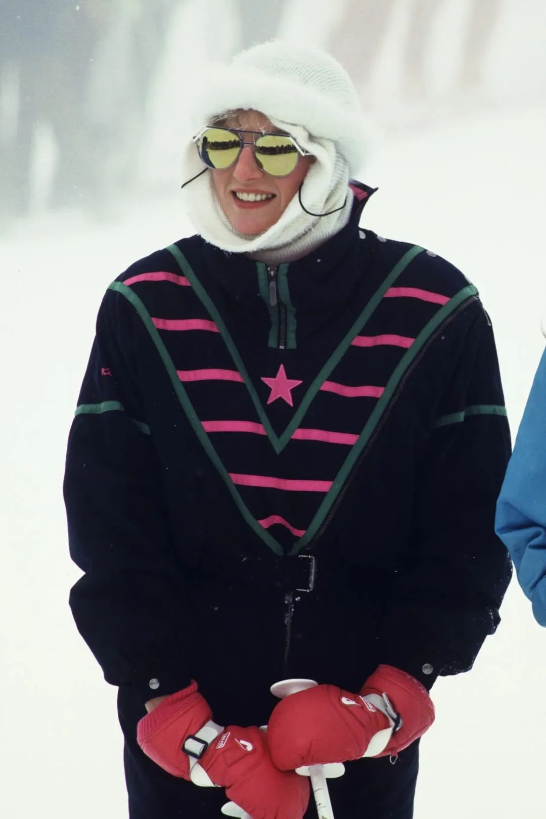 另一套青蓝色滑雪服虽不如红色那款夺目,却在功能设计上增添了不少拉链细节。戴安娜用白色手套和风帽与饱和的蓝色做中和,微微敞开的领口也体现着王妃一如既往的率性。
