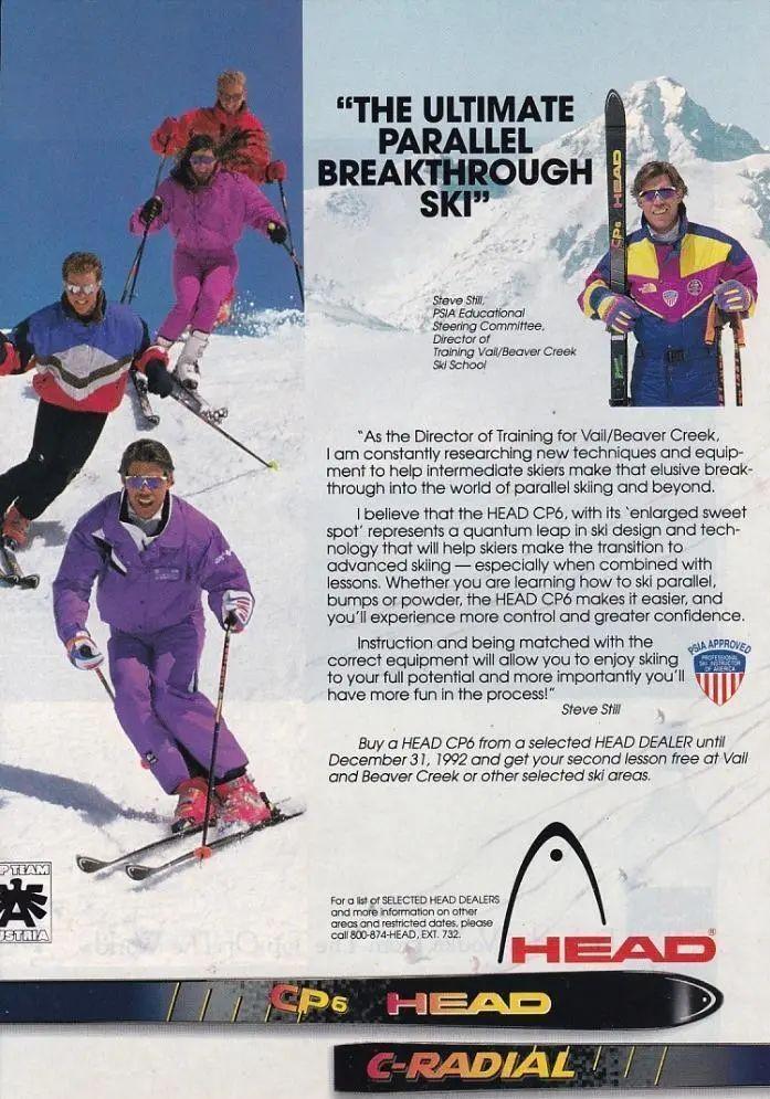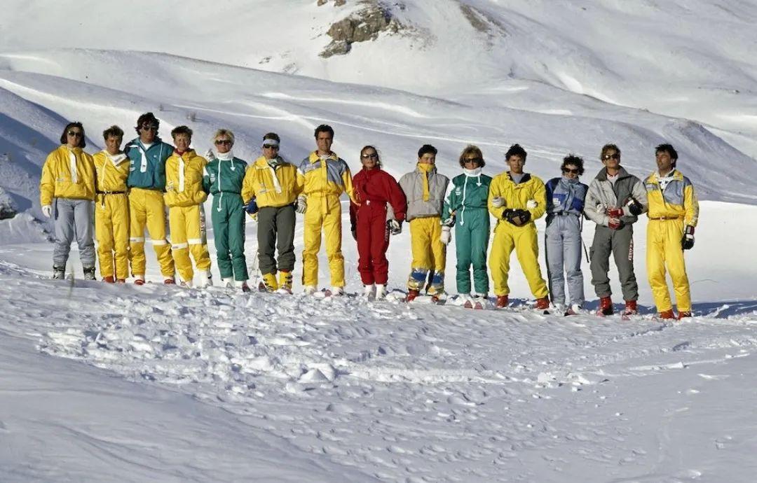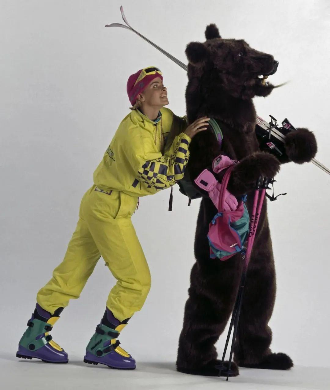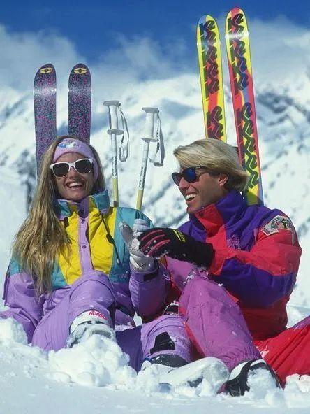 80年代的欧美曾掀起过一股运动热潮,五花八门的健身运动服遍布人们生活,几乎人手一件霓虹色Tracksuit,这种趋势自然也被带到了雪场。色彩靓丽的高腰连体夹克被广泛运用于雪服中,男女通用的版式也是早的Unisex制服之一。