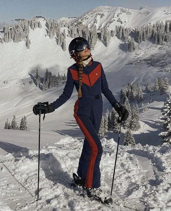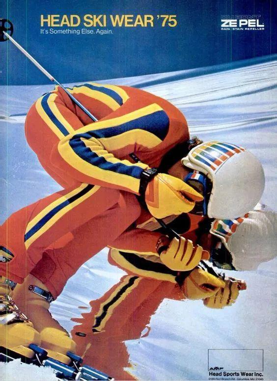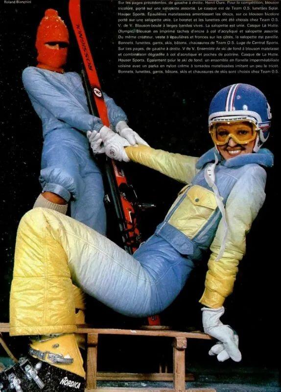 这种一体连身的版型也被称作“Onesies”,多由尼龙、氨纶等材质制成,具备防风防水的性能。同时内有薄绒填充,能起到基础的保暖抗寒,腰部和手腕处的收紧设计便于灵活行动。论功能性,40年前的滑雪服丝毫不比现在的差。