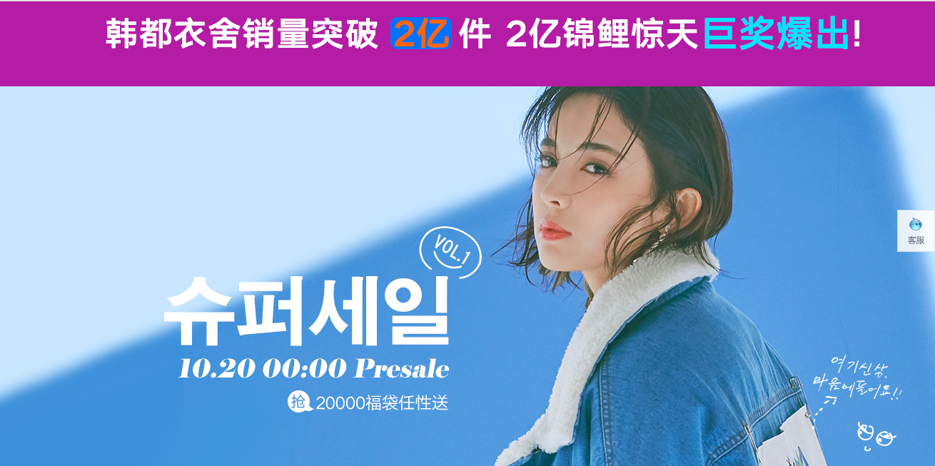 10月20日,天猫双11预售正式开启,韩都衣舍顺势推出了活动,购买到第2亿件的用户就能享受终身免单的福利。店铺顶通的位置,每隔12小时,就会更新一次,距离“两亿锦鲤”诞生还剩多少件的数据,营造紧张的抢购气氛。