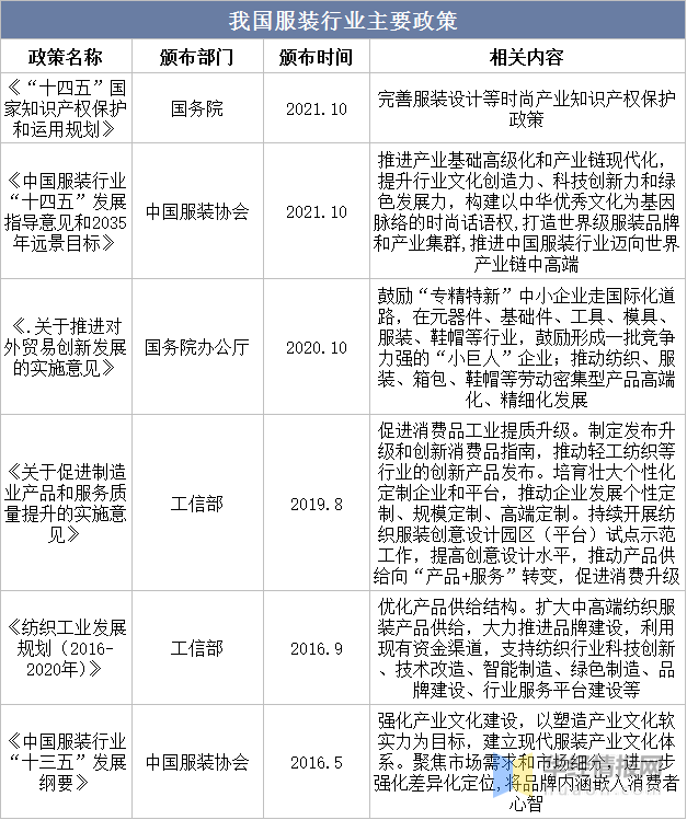 女装行业的良好发展离不开政策的指引与规范,出台了一系列政策鼓励和规范女装行业健康、有序发展。“十四五”时期,有关我国女装行业的政策规划频发,完善了中国女装行业政策体系,进一步促进我国女装行业发展。