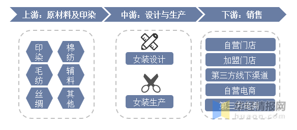 中国女装行业产业链上游包括印染、棉纺、毛纺、辅料以及丝绸等行业;中游为女装的设计生产环节;下游主要是线下门店以及电商等销售渠道。