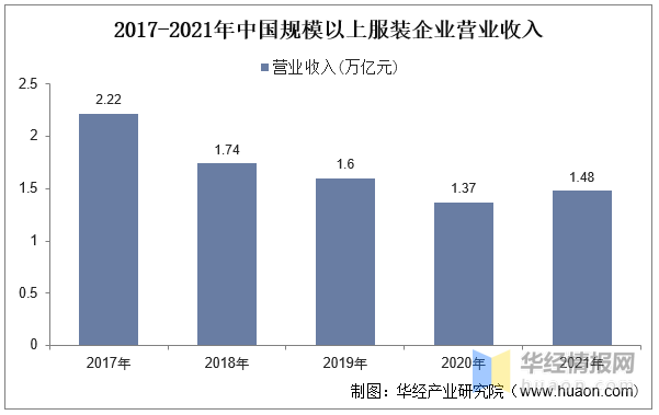 2021年,随着国内外经济恢复以及消费需求回升,我国服装行业恢复稳定发展的趋势。据统计,2021年中国规模以上服装企业营业收入为14823.4亿元,比2020年增加0.11万亿元。