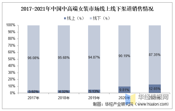 2017-2021年中国中高端女装市场线上线下渠道销售情况