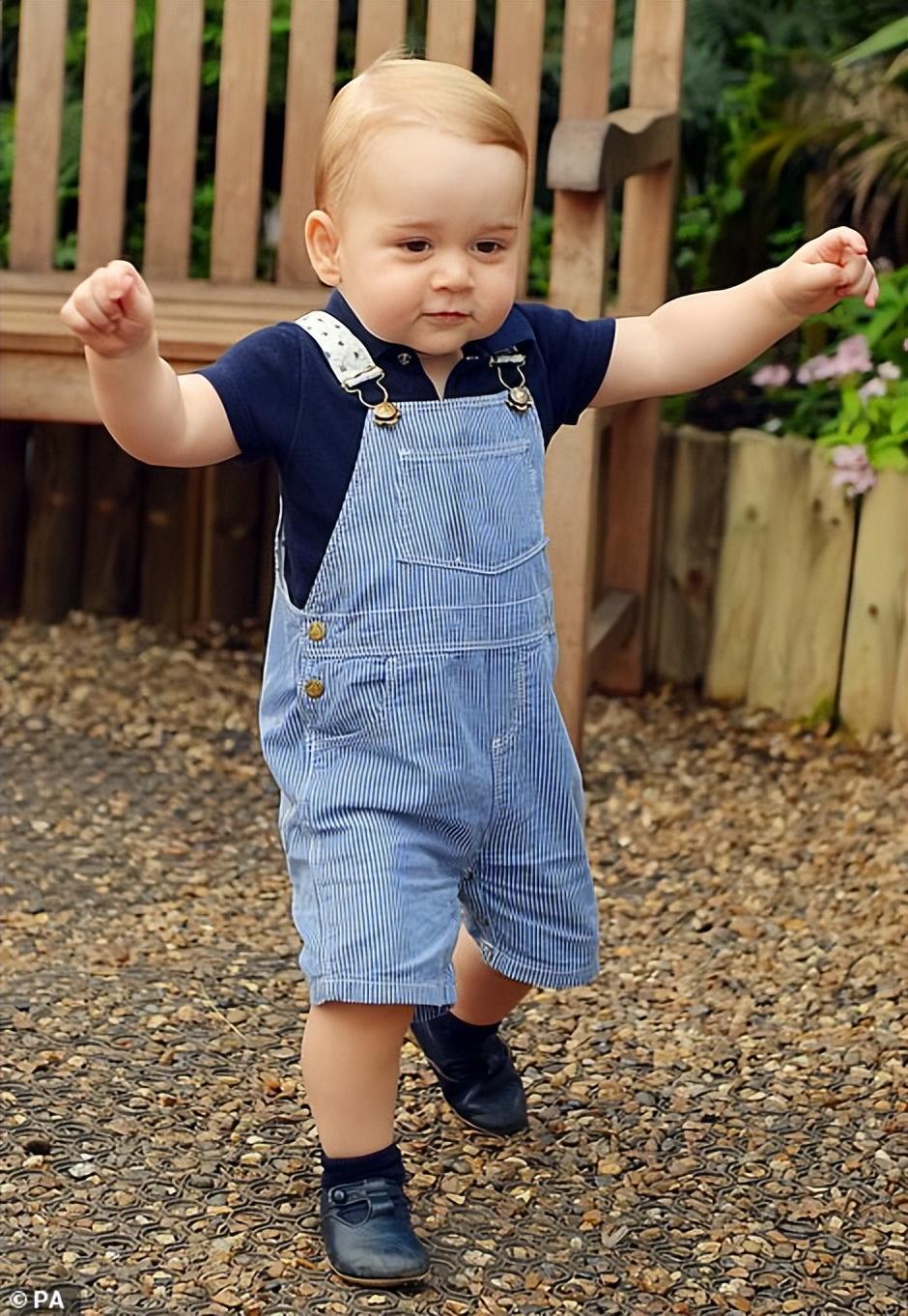 这是乔治王子刚刚会走路的时候,1岁生日照展现了乔治可爱的瞬间,而穿着背带路的乔治王子,胖嘟嘟惹人喜欢。