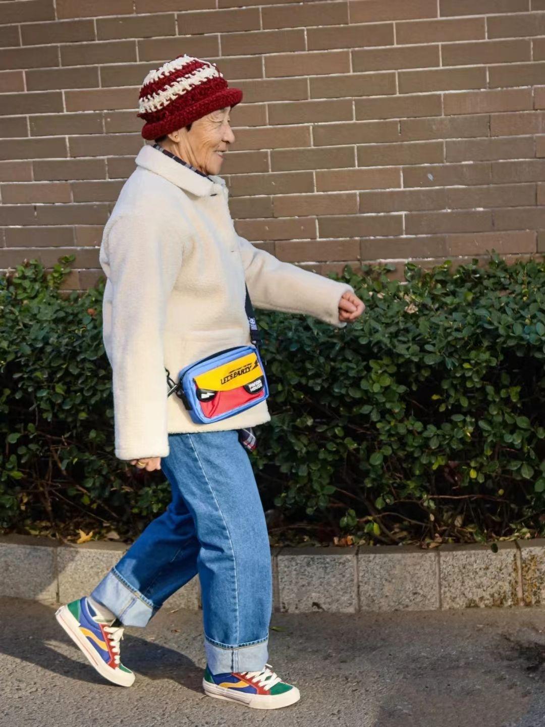 摇粒绒过腰短外套配蓝色牛仔裤,简单时髦又减龄,学时髦奶奶用彩色斜挎包强调腰线,会更有魅力。