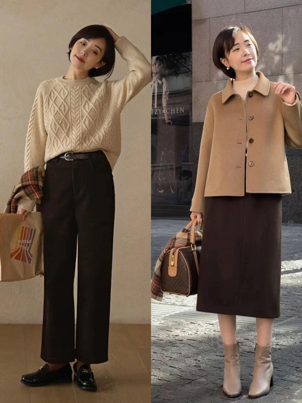 比如博主小娇用杏衫配深色直筒西裤与深棕色长裙,温柔衬肤,又层次分明!