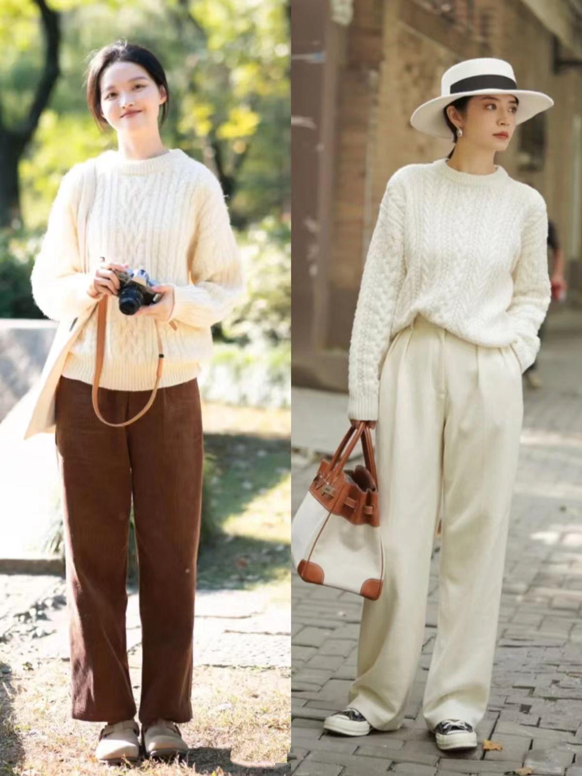 暖杏色毛衣保暖衬肤,小姐姐们可以学博主小李切让选取绞花款式,配棕裤、白裤都能为简洁造型注入几分俏皮感!