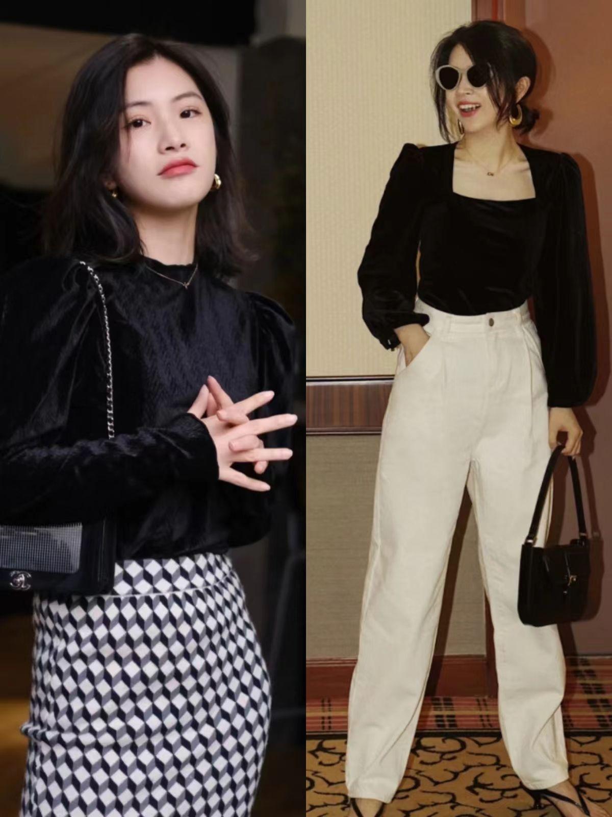 黑色丝绒衬衫也是极好选择,不一定要选常规款式,学博主三木选择采用独特领型的黑色丝绒衬衫,不仅能够通过露出锁骨化解黑色系的沉闷,还能延伸颈线、调整头肩比例。