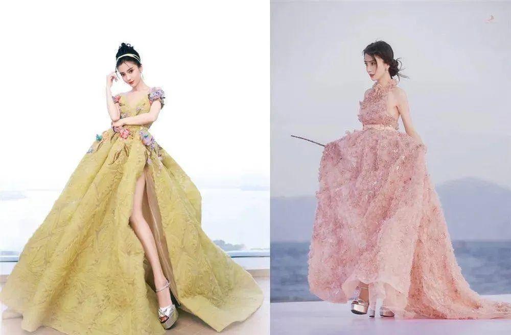 同时,王楚然的这件礼服也和迪丽热巴之前的造型略有撞款,