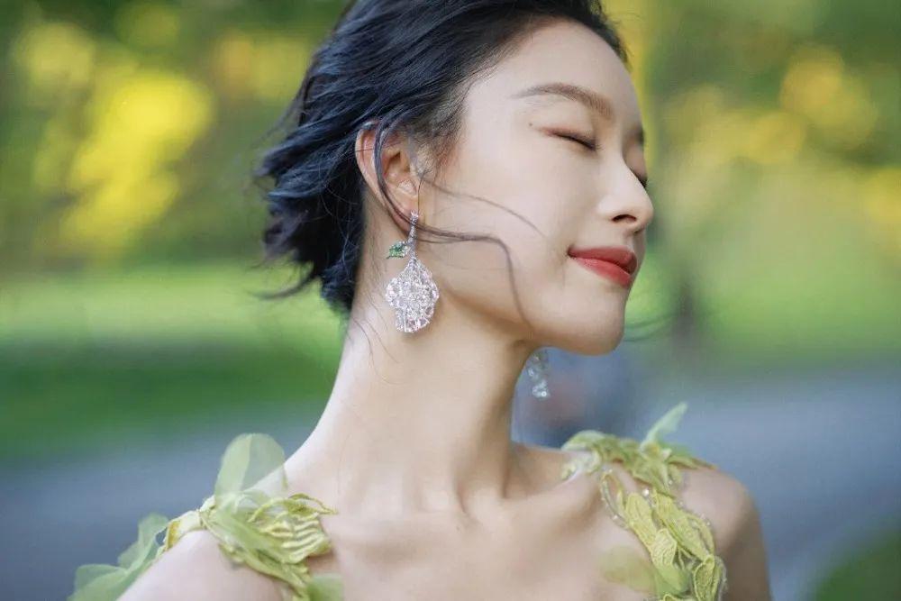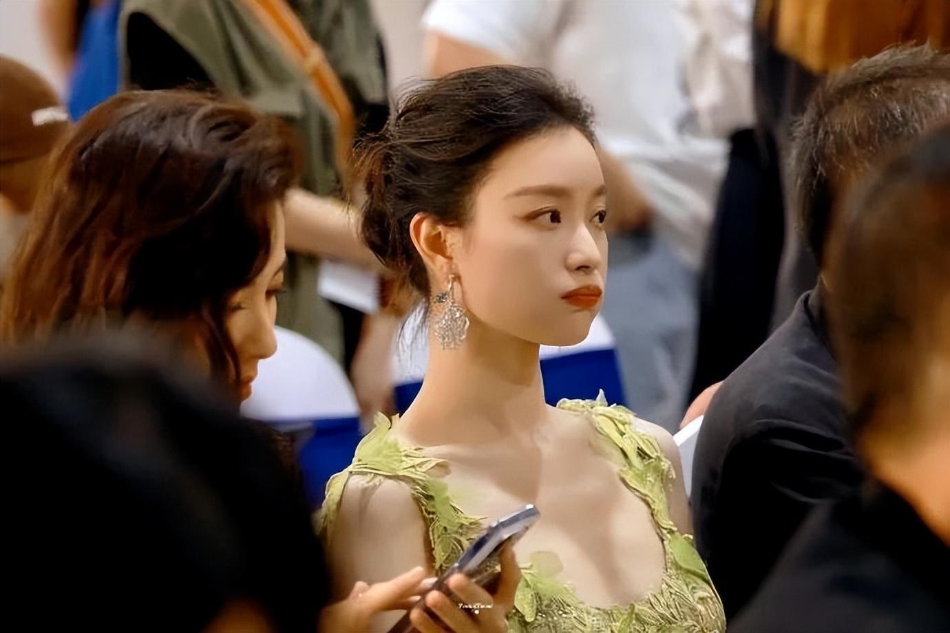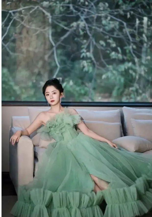 淡绿色胸前攒花薄纱长裙,让娇小玲珑的谭松韵,这一次显得格外水灵。