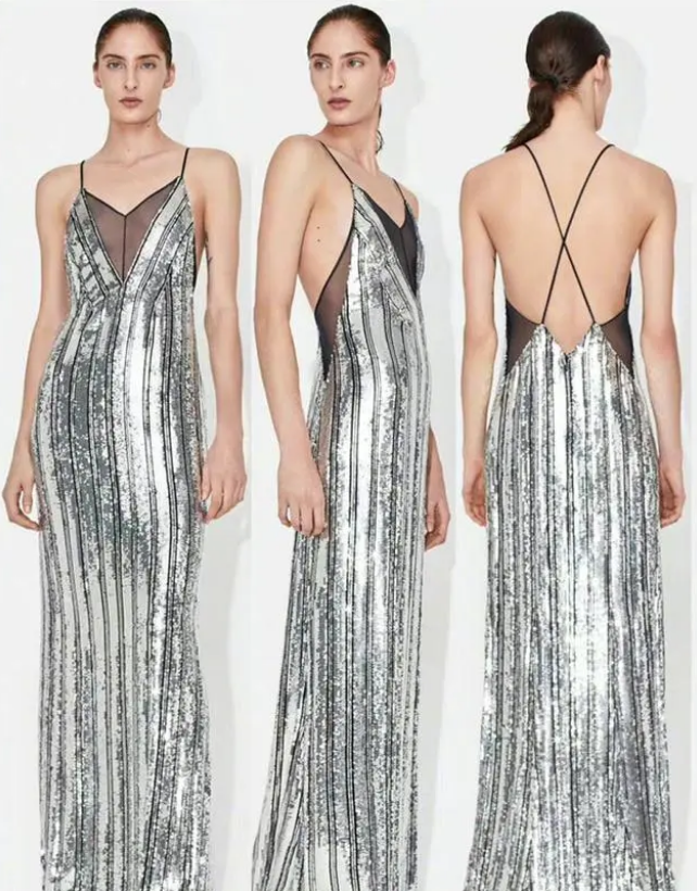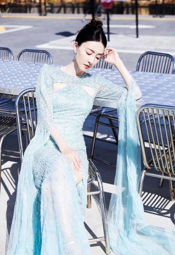 在今年的一场时尚杂志活动中,童瑶就选择了一件银色竖条纹的镂空礼服。
