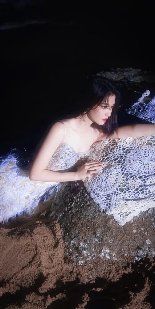 一袭白色吊带镂空长裙,喊出了“美人鱼”的设定,力求氛围感先营造够。