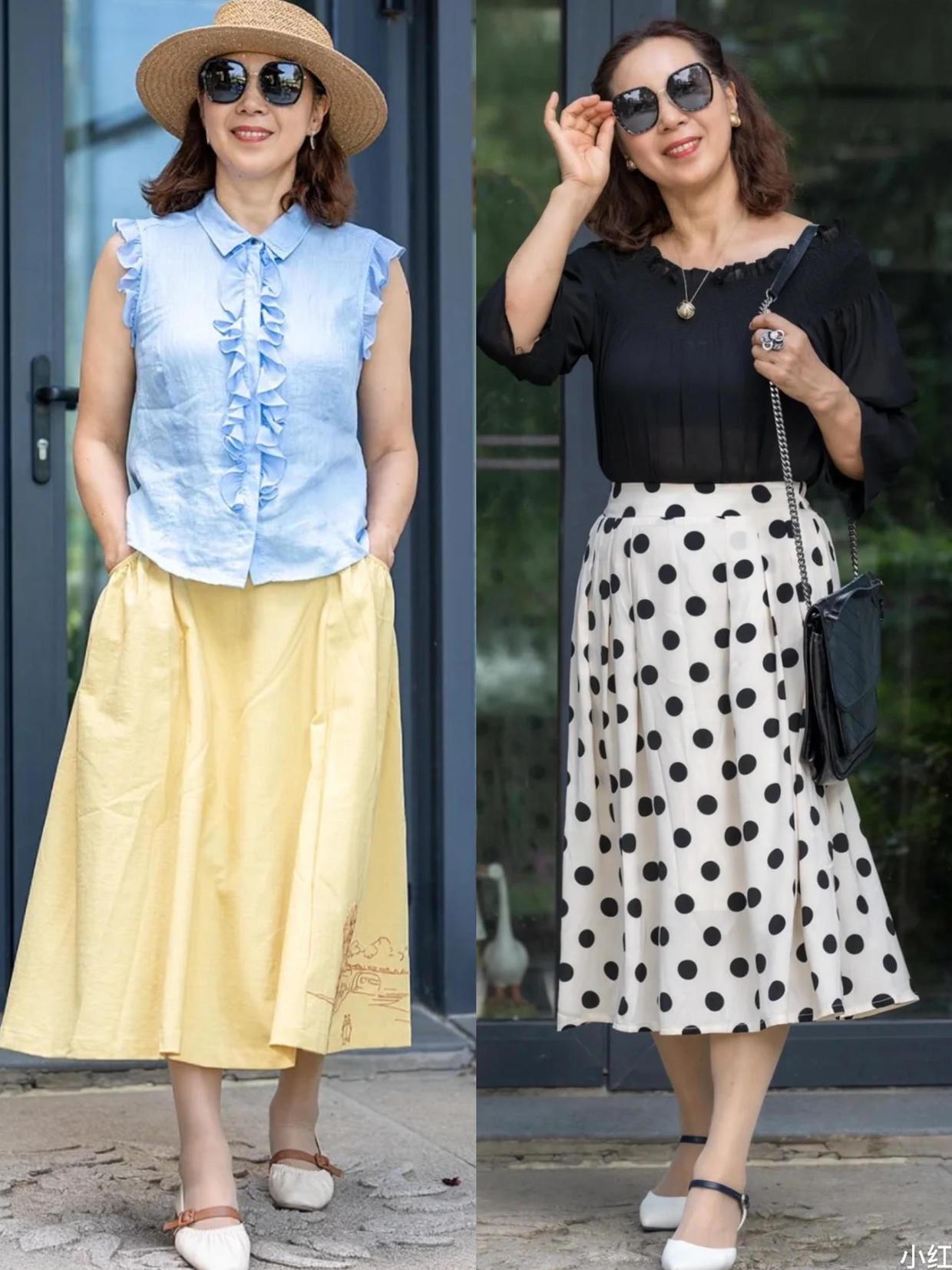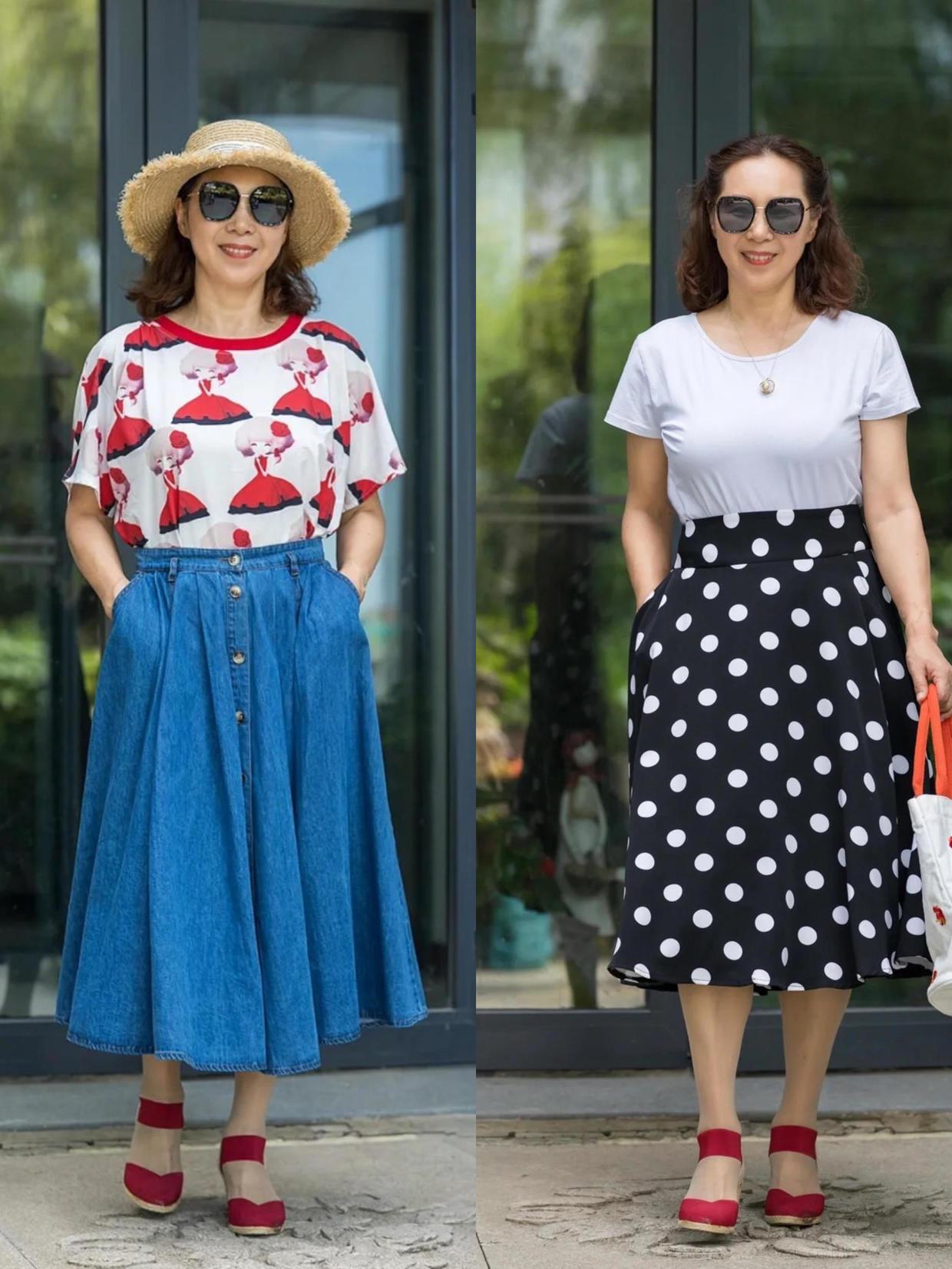 这些过膝半身裙的搭配也挺时髦的,不同的剪裁,不同的设计都可以凸显出高级感,牛仔半身裙,波点半身裙的搭配都有各自的魅力,而且这些裙装也都特别的显年轻,年龄过了50岁还是可以尝试一下这样的搭配,让你视觉上看着更加有魅力。