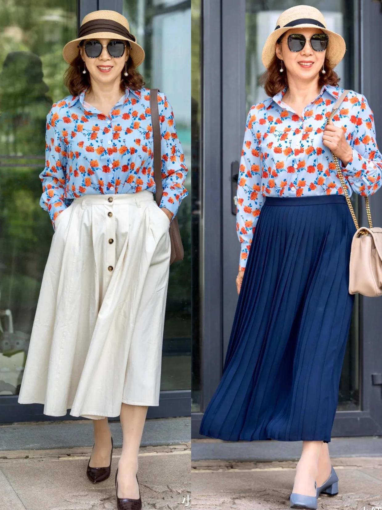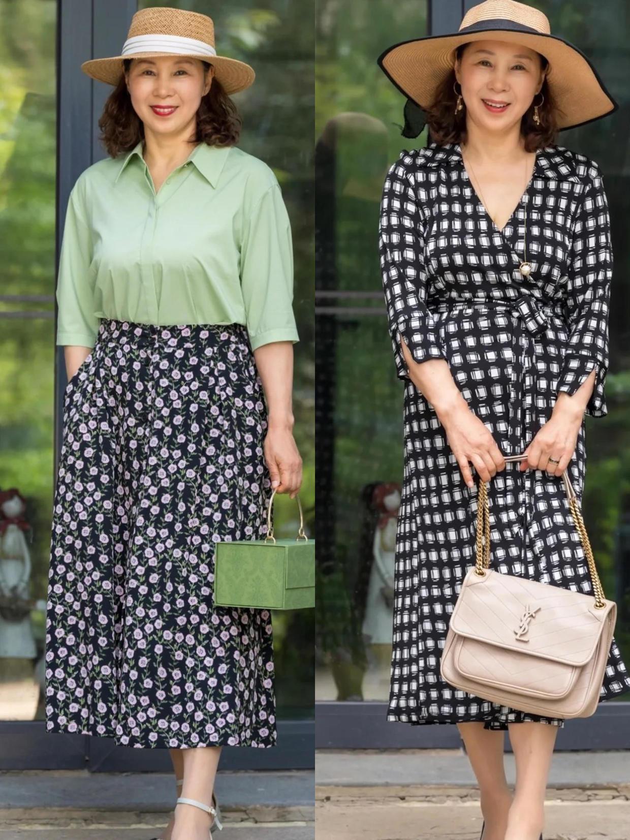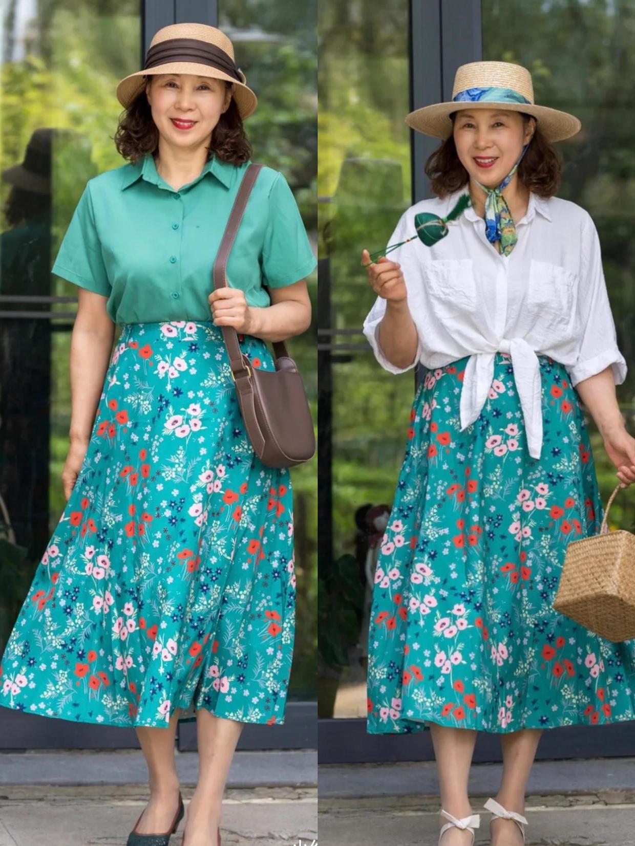 衬衫和半身裙的搭配挺经典的,普通女孩可以直接照搬,像这些奶奶用短衬衫配高腰裙,白色衬衫,绿色衬衫也都可以搭配起来,很有气质,结合了这些高腰的半身长裙,可以修饰胯宽问题,也能够演绎出轻盈和飘逸的感觉,再加上塞衣角的方式修饰了腰身,就可以调节你的比例喽。