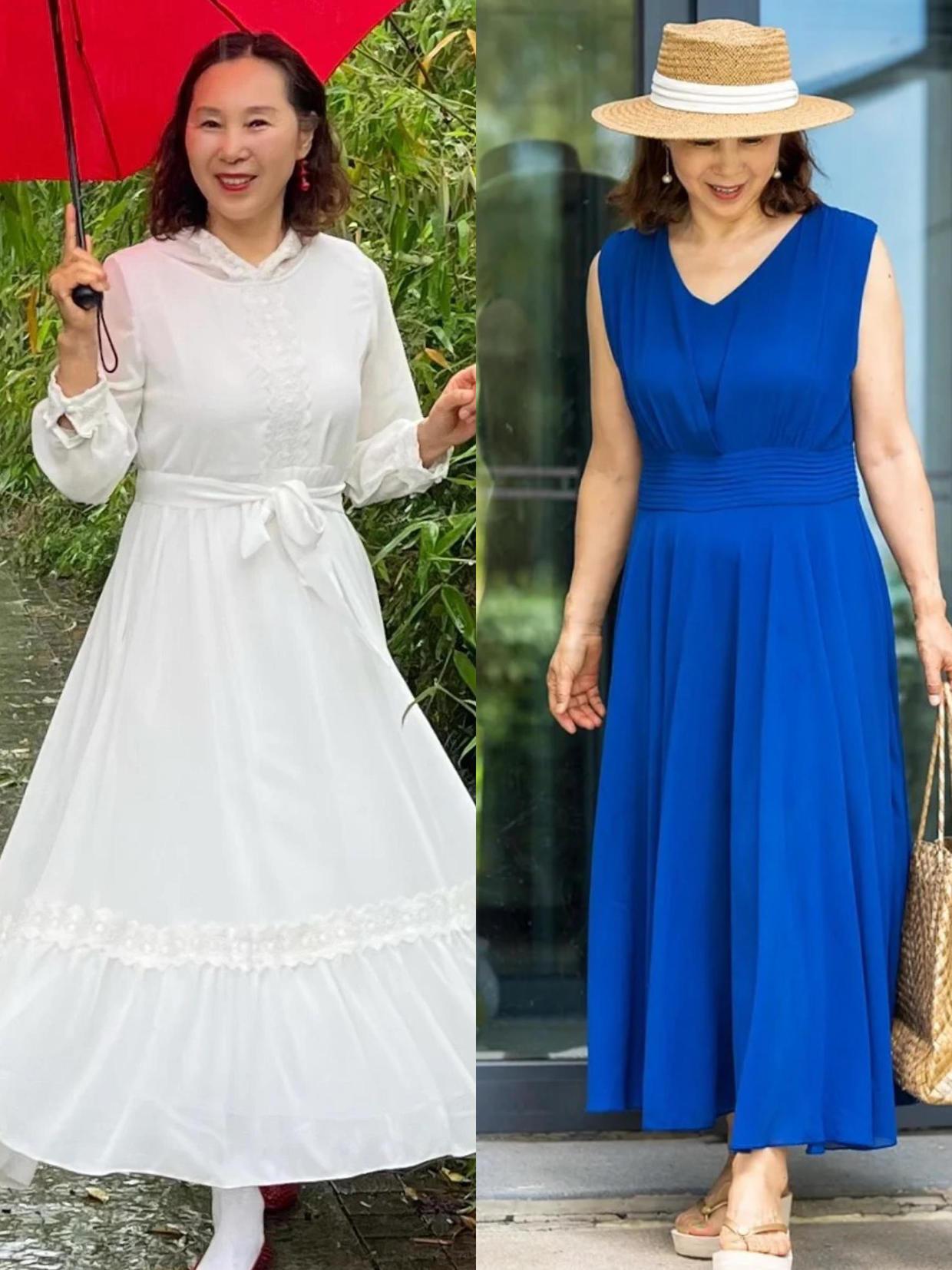 到了中年阶段,穿衣打扮也不要总是局限于普通的黑白灰,要想穿得好看,各种流行的色彩可以运用起来,就像这种蓝色,白色的裙装穿搭,这也可以释放出独特魅力,这些流行的色彩显得整个人都更加温柔,还能够帮助我们去修饰皮肤。