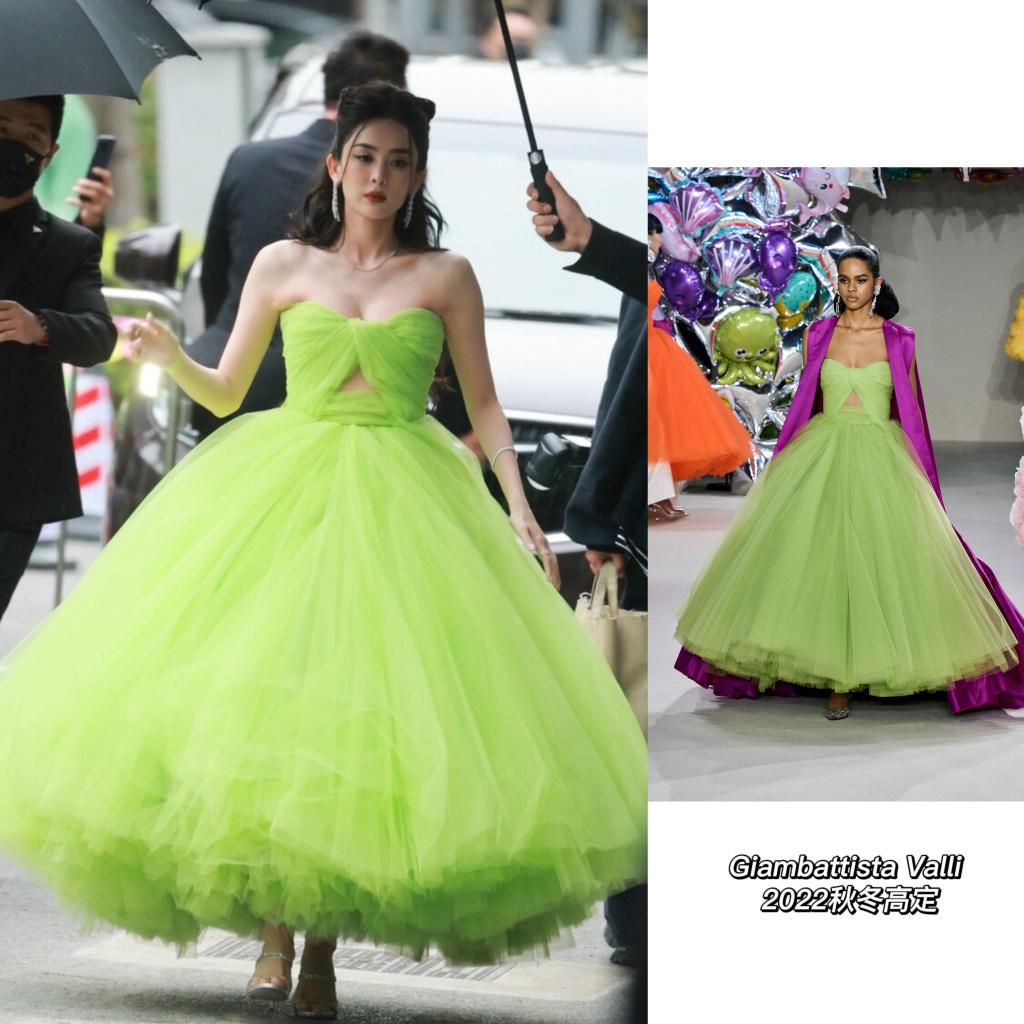 当然,肤白貌美➕身高不输模特的娜扎,穿上这套绿色Giambattista Valli 2022 F/W Haute Couture 的礼服还是很美很仙的,达成了迪士尼公主出巡的果,但是这种横向拉宽的超大蓬蓬裙,加上不及地的长度,会把人“压扁”,压身高,所以这套造型不是美女的佳水准。
