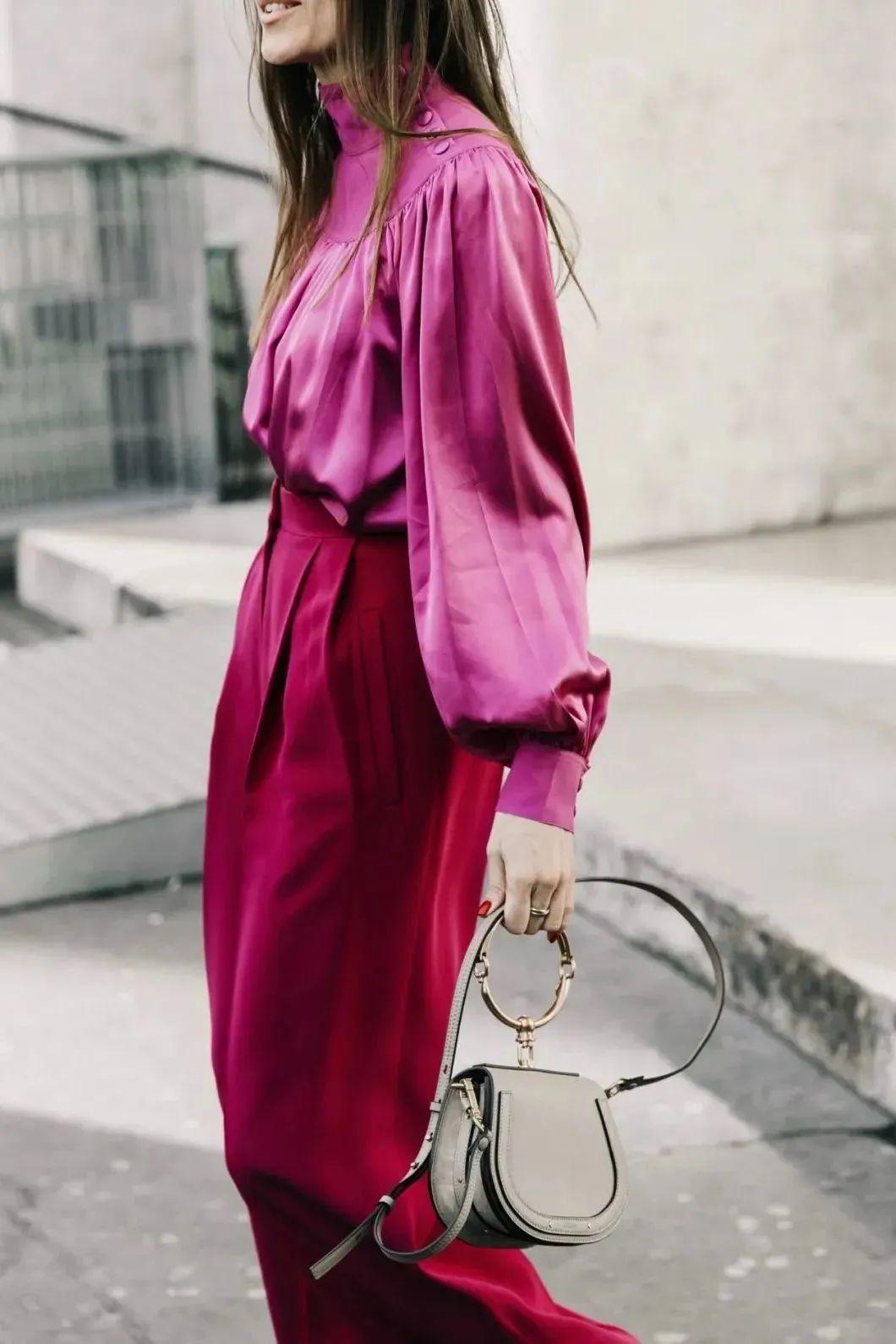 饱和度高的颜色应该怎么搭?简单的就是加入中性色。洋红色遇上黑、白、灰能起到相互平衡的作用,穿衣不喜欢太高调的女生可以尝试一下这种颜色搭配。